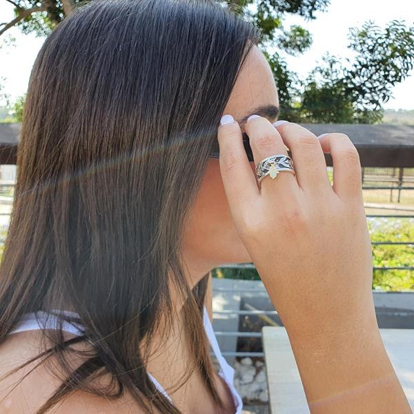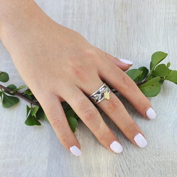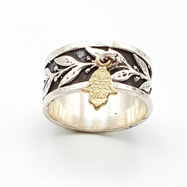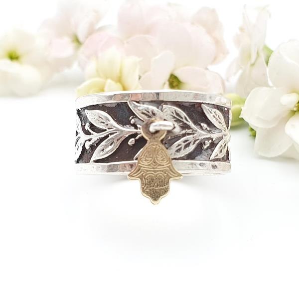טבעת כסף דגם עלים וחמסה מגולדפילד 14Kנופלת R-47